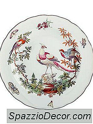 A moda Chinoiserie de meados do século 18 continua forte como pode ser visto nesta placa de Richard Ginori com galos verdes e dourados tocando em um campo. Experimente emparelhar com placas geométricas brancas e douradas para um toque eclético e contemporâneo.